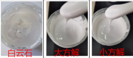 另如上圖示為白云石、大方解和小方解添加至乳膠漆(40%添加量)中并50℃熱儲7d狀態(tài)對比情況,白云石樣漆呈膏狀,已經(jīng)很難攪動,大方解和小方解樣漆仍呈現(xiàn)出較好的狀態(tài),可見方解石系在乳膠漆的穩(wěn)定性好于白云石系。