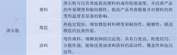 滑石具有潤滑性、耐酸堿性、絕緣性、熔點高、遮蓋力良好、光澤好、吸附力強等優良的物理、化學特性。在塑料、橡膠、造紙、油漆等行業有著廣泛的應用。