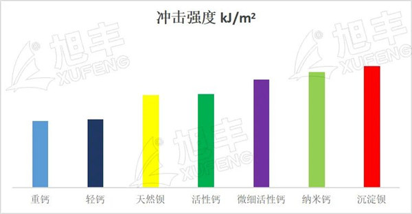 針對無機材料的應用特點,將重質碳酸鈣、活性碳酸鈣、微細活性碳酸鈣、輕質碳酸鈣、納米碳酸鈣、天然硫酸鋇和沉淀硫酸按20%的比例填充到ABS中,考察其對ABS沖擊強度的影響,具體如下圖: