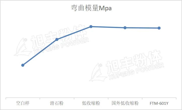 從上圖可以看出,FTM-601Y較滑石粉具有較高的彎曲模量,同時相對純PP樹脂來說,彎曲模量也有大幅度的提升,這說明FTM-601Y具有高模量的特性。