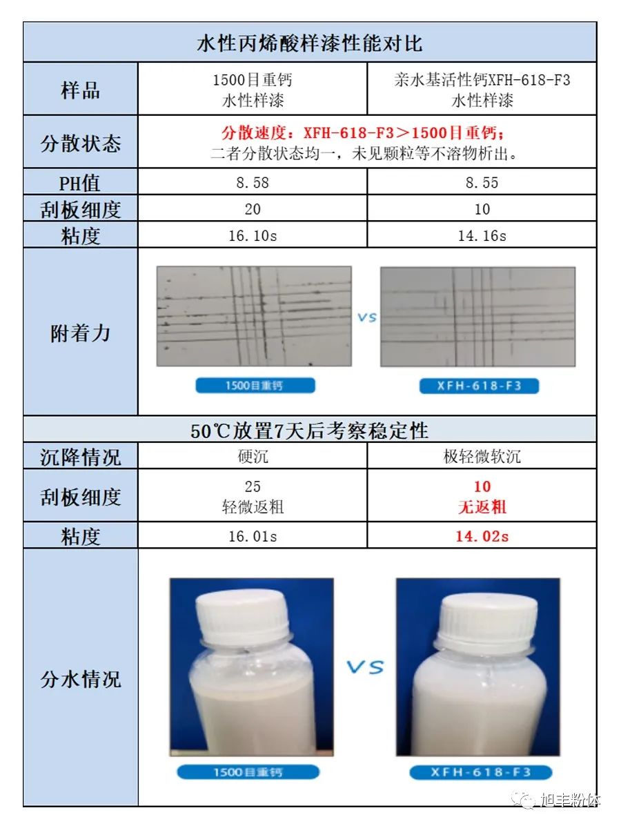 對比可知:親水基活性鈣XFH-618-F3比普通1500目重鈣潤濕速度快、分散效果好,附著力及儲存穩定性提高。更多應用信息或獲取樣品請來電咨詢,旭豐粉體竭誠為您服務!
